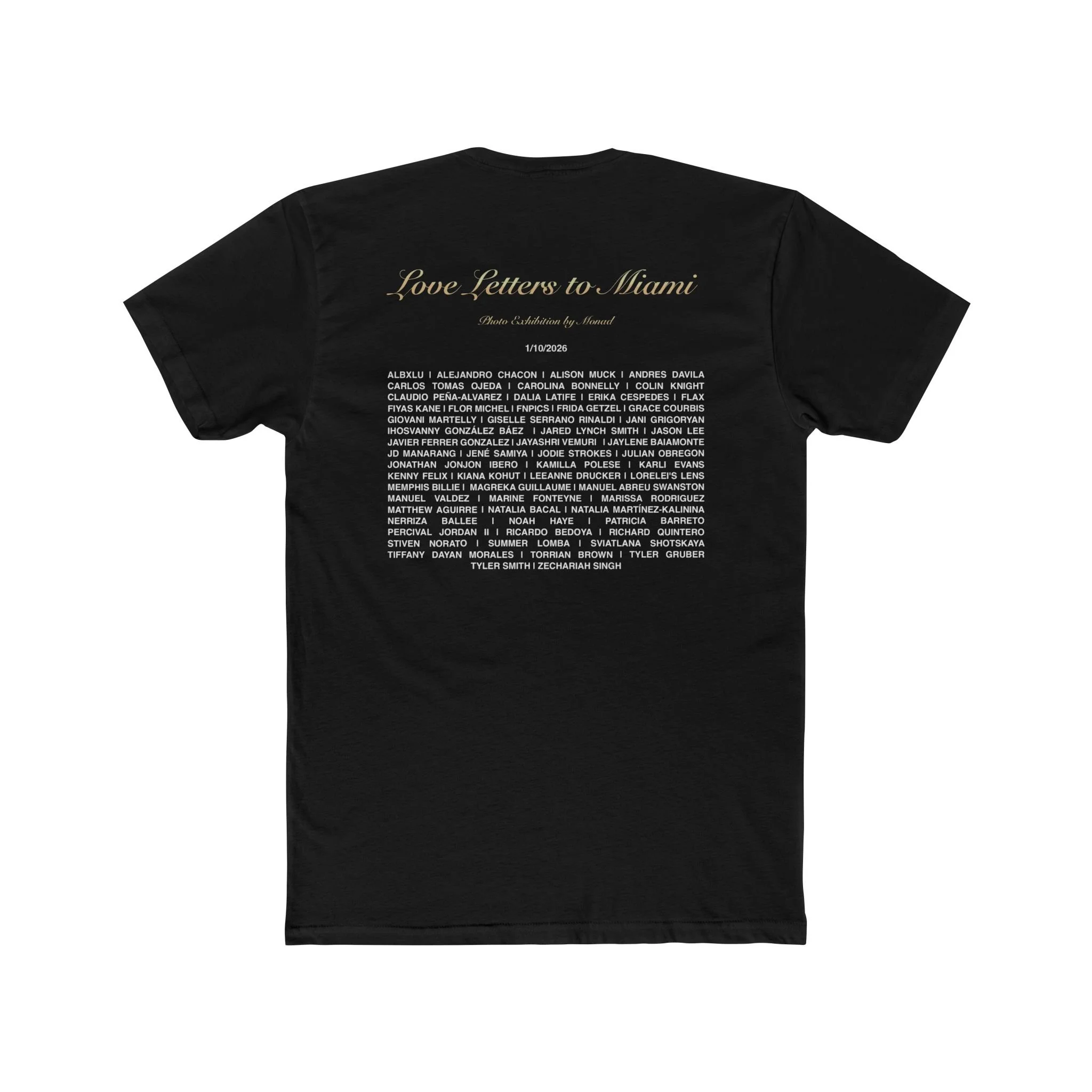 Printed on soft, premium cotton, the design turns the exhibition’s essence into wearable art. On the front, the words “LOVE LETTERS TO MIAMI” appear in sleek, modern typography — echoing the city’s blend of tradition and innovation. On the back, the names of all exhibiting photographers come together in an elegant grid.